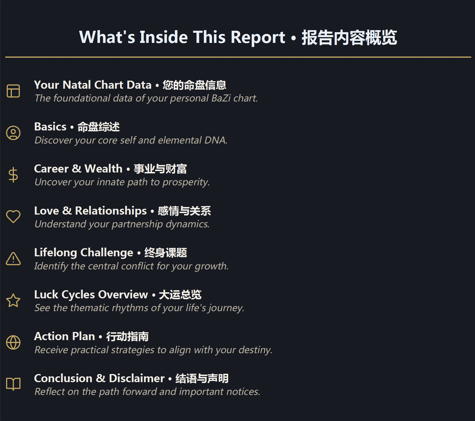 Your Destiny Map is a personalized Taoist life reading — revealing your strengths, luck cycles, and the timing that shapes your path.